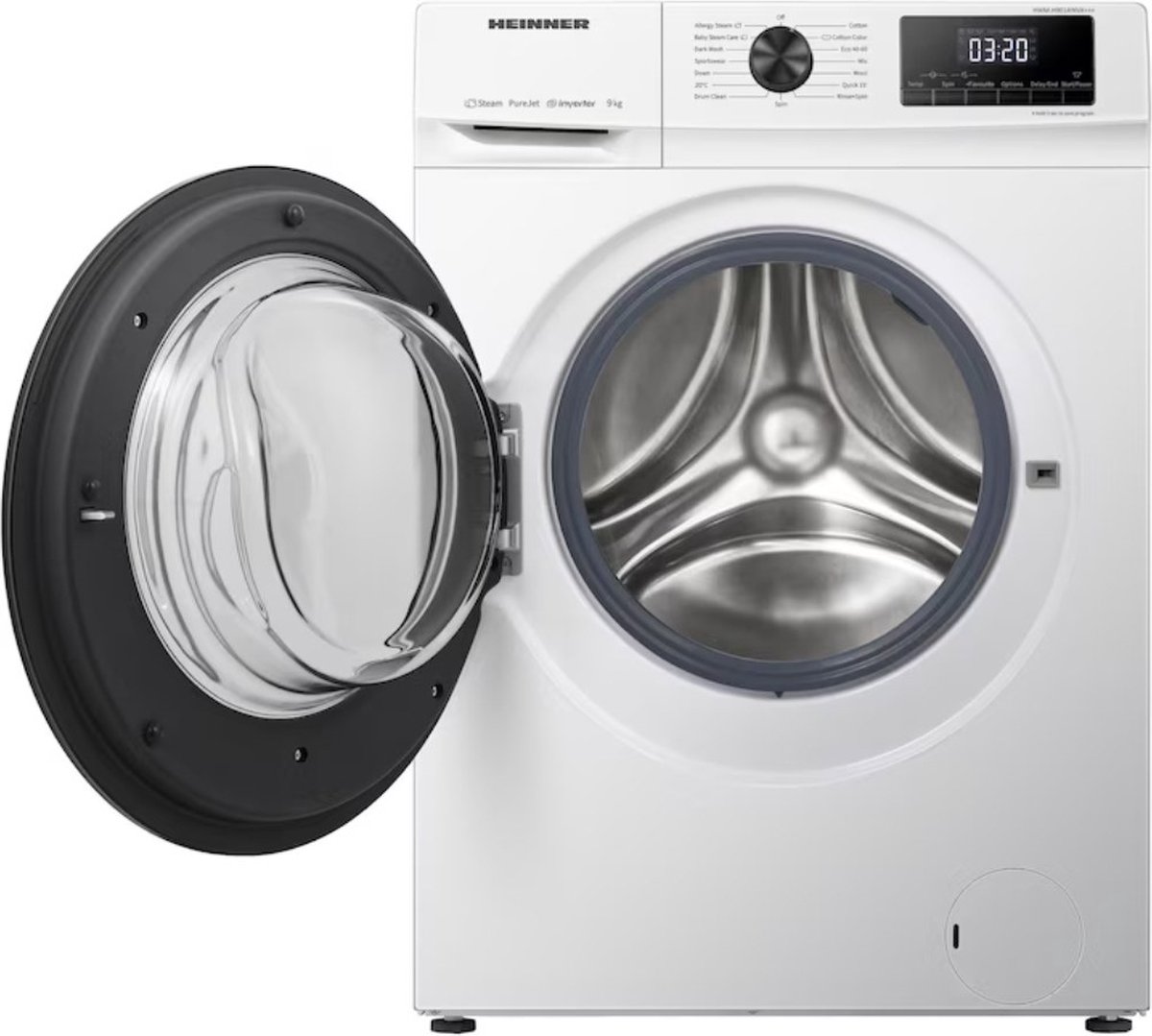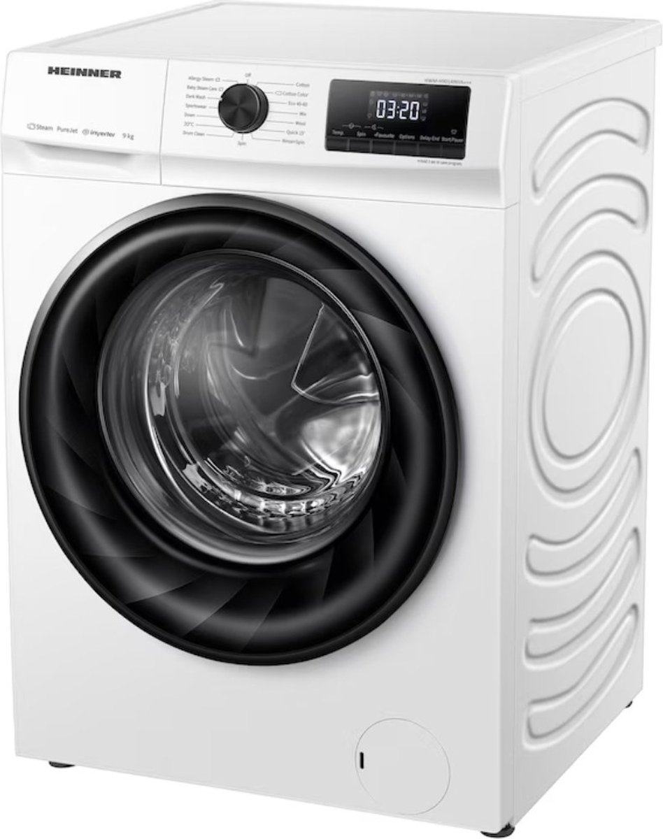 Heinner Wasmachine met Stoomfunctie – 9 KG – Koolborstelloze Motor – 15 Wasprogramma’s – Zeer Stil 72dB – LED display – 1400 RPM – Energieklasse A – 5 Jaar Garantie – Wit
